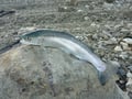 An der ersten, verheissungsvollen Stelle angelangt warfen wir die Köder aus. Woww......schon beim zweiten Wurf mit der Elritze hatte Kevin einen heftigen Schlag verspürt....Biss !! Das ging ja sehr schnell und der Fisch zog sofort in die Bremse und versprach somit Gutes. Fantastisch, was sich im Wasser wehement wehrte und umherwälzte. Eine wohlgenährte 64iger Namaycush hatte sich am Köfi verbissen und konnte nach 3min Drill gut gefeumert werden.