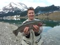 Nach dem feinen Essen legten wir los. Uns war klar, dass die Fischerei in diesem kleine See nicht einfach sein würde. Längere Zeit war vorerst noch nichts zu sehen von Fischen doch dann bekam ich plötzlich einen harten Biss. Nach einem spannenden Drill durfte ich mich an einer wunderschönen wilden Namaycush erfreuen…ein makelloser Fisch.