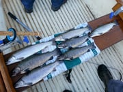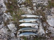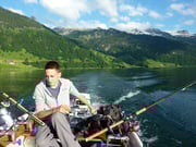 Ich war heute mit Carlo verarbredet. Um 6.00 Uhr warf ich dann meine Köder aus. Ich musste zuerst die Standtiefe der Forellen herausfinden. Dies gelang bald und so hatte ich in kurzer Zeit 4 schöne Refo's beisammen.