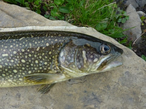 Mein Vater war ja am Samstag mit Anglerkollege Erwin am Bergsee unterwegs. Ich (Kevin) war am Arbeiten und hatte deshalb keine Zeit. Für mich war jedoch klar dass ich meinem Lieblings-Bergsee am Montag einen Besuch abstatten werde. Gesagt, getan....Rucksack und Rutentasche ins Auto und los geht's. Nach der langen Autofahrt stand noch der anstrengende Aufstieg bevor. Dieser war jedoch rasch bewältigt. Überall sah ich beim Aufstieg schwarze Salamander. Interessante Tiere. Als ich oben beim Bergsee angekommen war, eilte ich sofort zu meiner Lieblingsstelle, und die Suche nach den wilden Namaycush ging los. Kaum den Köder ausgeworfen hatte ich nach 3 Minuten schon den ersten Biss......und was für Einer. Der Namay, der am anderen Ende der Leine hing, zog mal wieder kräftig in die Tiefe. Die Rute bis 50gr Wurfgewicht war krumm wie noch nie und es war trotz der 0.26er Monoschnur schwierig den Fisch unter Kontrolle zu bringen, da er kaum vom Grund wegzubringen war. Nach ca. 2-3 min Drill brachte ich den Fisch jedoch allmählich näher und durfte Ihn das erste Mal im Wasser bestaunen. Der hatte sicher über 60cm und funkelte so richtig im Wasser mit seiner wunderschönen Zeichnung und dem schneeweissen Bauch. Doch dann passierte es......Ca.3 Meter vor dem Ufer hat es der grosse Namay tatsächlich geschafft meinen Köder auszuhebeln. Der Namay war jedoch immer noch relativ nah am Ufer, weshalb ich ins Wasser stürzte um ihn zu packen. Das nützte jedoch nichts. Er schwamm glücklich davon und ich habe mir ordentlich die Hand an einem Stein aufgerissen. Das wäre wohl meine bisher grösste Namaycush gewesen.